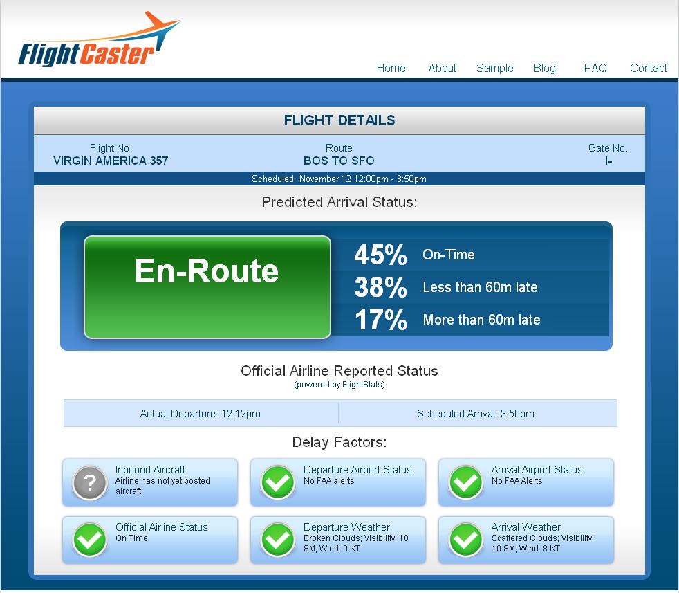 I’m pretty sure I’m not the only person who hates waiting around an airport with no idea what’s going on with my flight. Flightcaster will tell you the chances of a delay well before the airlines will. So far I’ve been very impressed with both the prediction system and the UI, which is very intuitive and pretty. I had a pretty amazing experience with Flightcaster last week when flying to San Francisco from Boston. Before I left, the flight was listed as on-time, while Flightcaster predicted it was “probably delayed”. I arrived at the airport, and the flight was delayed by two hours, due to weather at SFO. While waiting, I checked Flightcaster again and it predicted we would be leaving shortly, and within minutes an announcement came through that the two hour delay had been shortened to a 20 minute delay. Nifty.